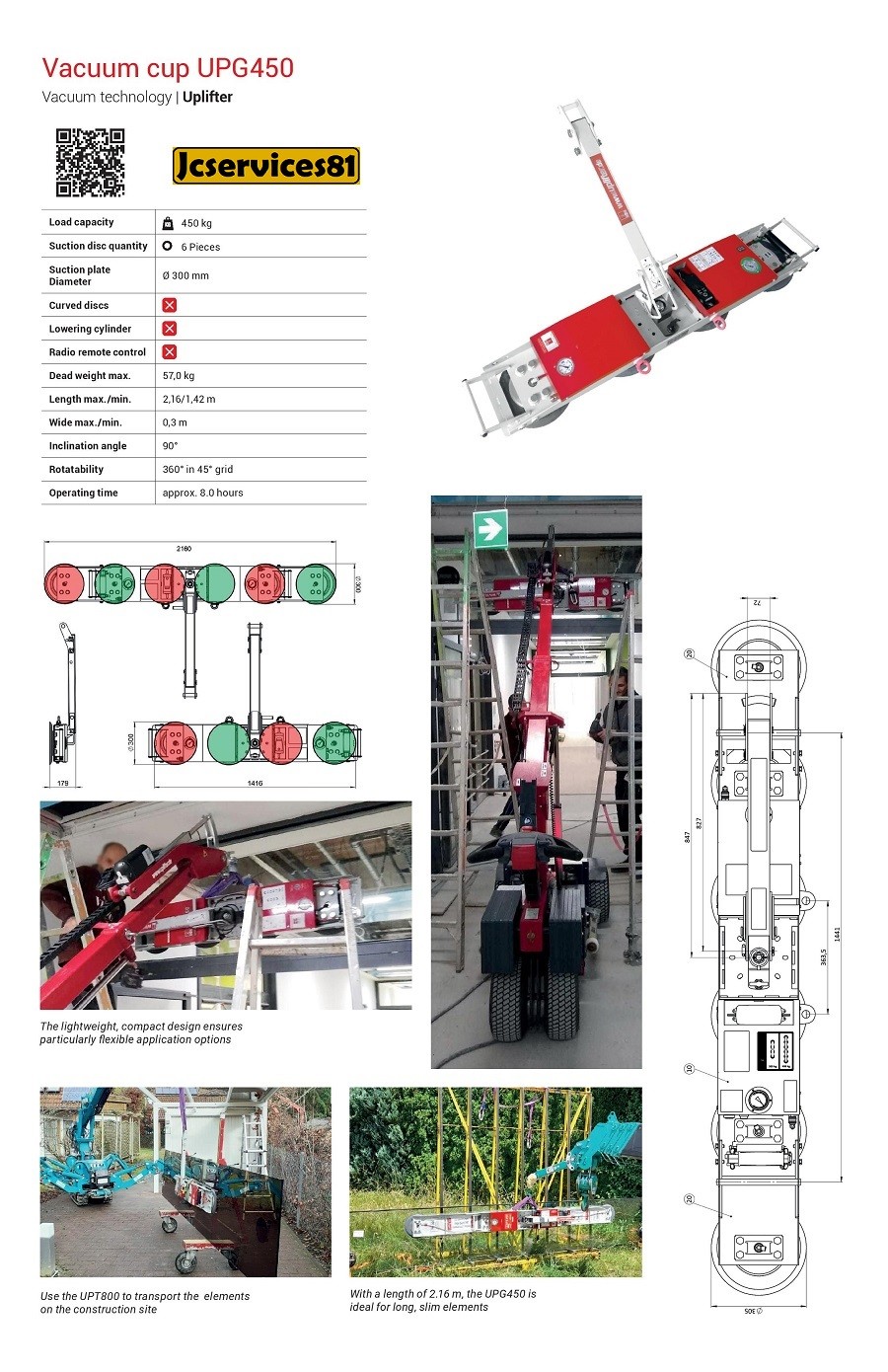 Les ventouses montées(diamètre 300 mm) garantissent une bonne adhérence et une puissance d'application sur le chantier. Lors de l'aspiration, il est important que la surface soit toujours lisse, droite et imperméable à l'air. L'UPG450 effectue automatiquement le processus d'aspiration en appuyant sur un bouton.