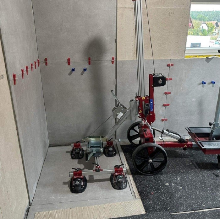 Un appareil de montage et de pose avec unité de basculement est ici idéal pour les grands carreaux de sol et de mur.